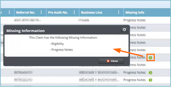 • La columna Missing Info en Claims Tracking ha sido actualizada para ofrecer una visualización más clara de la información faltante. Cuando solo falta un tipo de información, se mostrará el nombre de dicho tipo en la columna. Si faltan varios tipos de información, se indicará el primer tipo y aparecerá un ícono de flecha verde que señala la presencia de información adicional faltante. Haga clic en el ícono para ver una lista completa de la información pendiente.