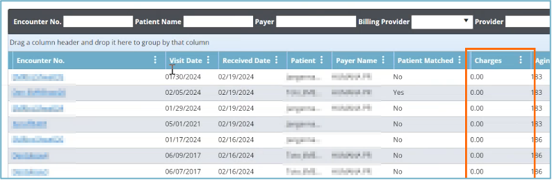 • La pantalla de EMR Encounters ahora incluye una nueva columna informativa opcional: Charges (Cargos). Esta columna muestra el total de los cargos asociados con cada encuentro. Para agregar esta columna a su vista, haga clic en el ícono de los “tres puntos” en la parte superior de cualquier columna visible para desplegar la lista de columnas disponibles. Luego, seleccione la casilla junto a la opción Charges (Cargos) para incluirla en la pantalla.