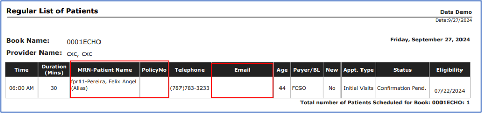 - Los informes impresos se actualizaron para incluir información adicional del paciente, mejorando la visibilidad en los reportes de citas. Los informes Regular y List han cambiado la columna Patient Name a MRN-Patient Name y han agregado las columnas Policy Number y Email al informe. En el informe Multiple, se ha cambiado el nombre del nombre del paciente a Patient y ahora incluye varios detalles del paciente, como el nombre, el MRN, el número de póliza, la información de contacto y el estado de elegibilidad.