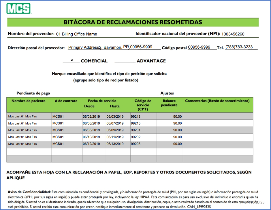 • Se ha actualizado la forma de ajuste (disputa) para la aseguradora Medical Card System (Comercial y Advantage) a su última versión.