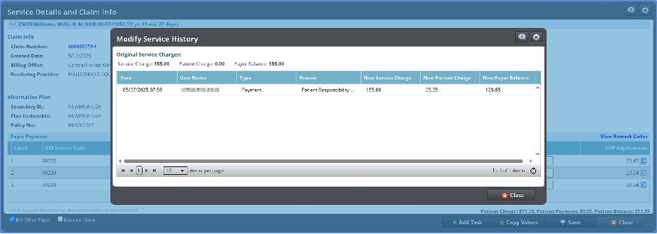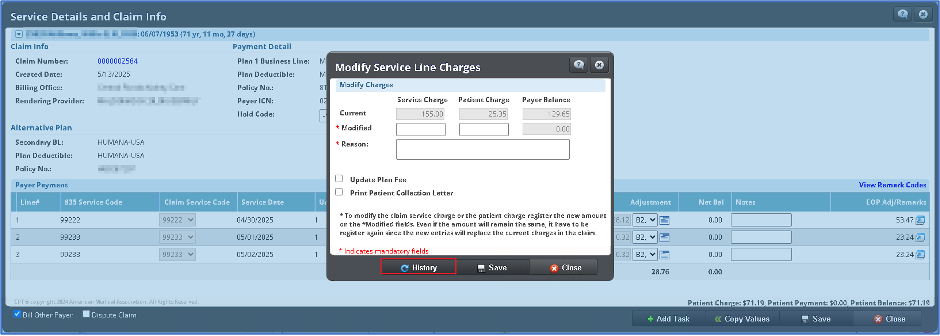 • El módulo de pagos de aseguradoras (Payer Payments) ha sido mejorada para poder manejar las modificaciones tarifas durante el proceso de reconciliación. La pantalla de Modify Service Line Charges ahora cuenta con un botón de History. Al hacer clic este abrirá la pantalla de Modify Service History en donde se mostrará el histórico de eventos de modificaciones de tarifas realizadas en la reconciliación del pago.