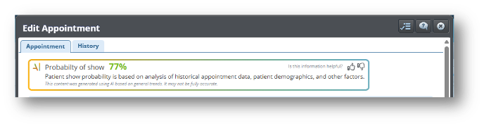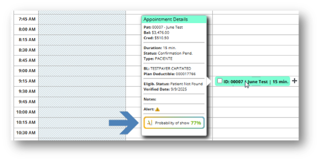 • Se ha incorporado una nueva funcionalidad al módulo de Citas mediante la integración de inteligencia artificial para predecir la asistencia de los pacientes. Esta herramienta estará disponible tanto al crear como al editar una cita, y también será visible desde el Libro de Citas al posicionar el cursor sobre una cita ya registrada. Es importante destacar que esta función solo estará activa para pacientes con historial de citas, ya que la IA se basa en patrones previos para generar sus predicciones.