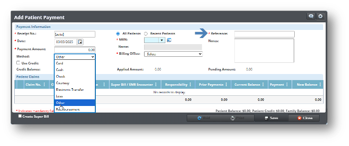 • Se ha añadido una nueva opción denominada Other al listado de métodos de pago, la cual permite registrar formas de pago distintas a las previamente estipuladas. Al seleccionar esta opción, se activa una validación para el campo Reference, con el fin de documentar adecuadamente el método utilizado.