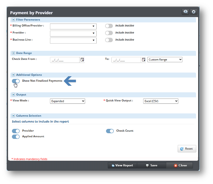 • El reporte Payment By Provider (Analytics > General > Collections > Payment By Provider) ha sido actualizado para incluir pagos registrados en la reconciliación, aunque no estén finalizados. Anteriormente, el reporte solo mostraba pagos de cheques finalizados. Con esta mejora, basta con que el pago de la reclamación esté registrado en la reconciliación para que los datos se reflejen en el reporte, lo que proporciona una visión más completa y actualizada de los pagos.