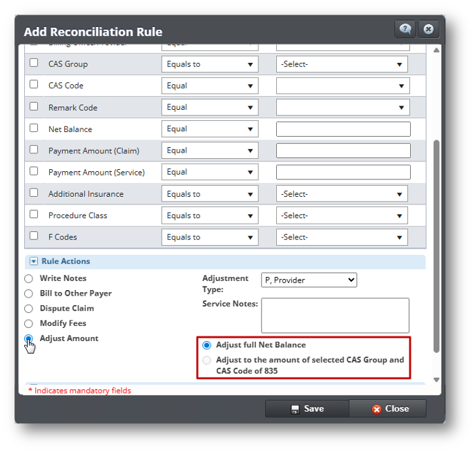 - Al ejecutar una reversión (rollback) de las reglas de reconciliación, el sistema revierte cualquier ajuste que haya sido aplicado como resultado de dichas reglas. Esto significa que los ajustes originales de la reclamación, previos a la aplicación de las reglas, se restauran automáticamente, devolviendo la reclamación a su estado anterior. SecureClaim realiza ajustes automáticos sobre los siguientes códigos: