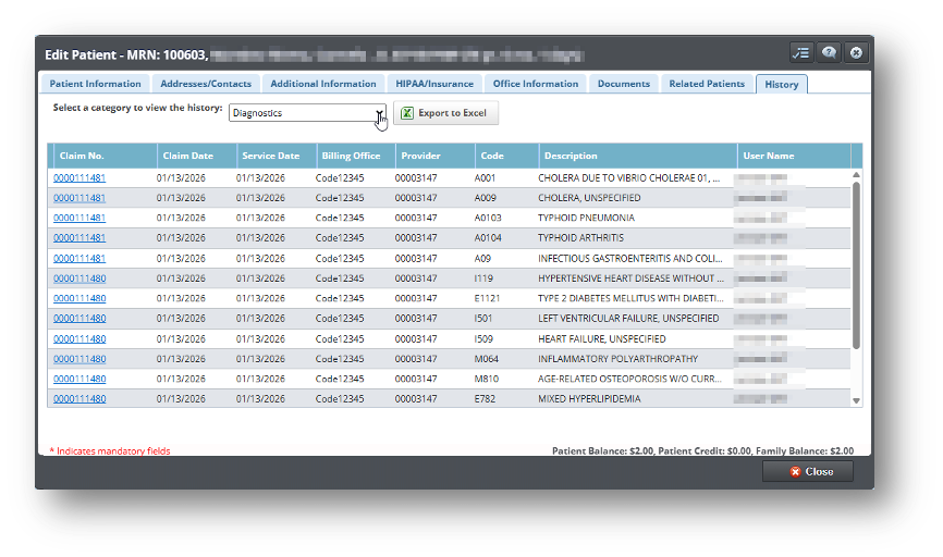 - Se actualizó el récord del paciente para que en la pestaña History se muestren todos los diagnósticos, incluidos los de admisión. Ahora se visualizan todos los diagnósticos presentes en las reclamaciones institucionales.