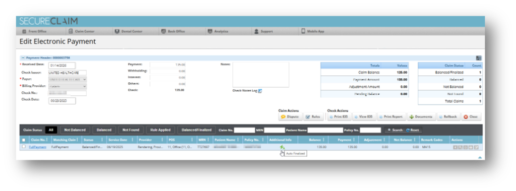 - Se agregó una nueva columna en la pantalla Service Details and Claim Info para mostrar los códigos modificadores. Estos códigos se reflejarán únicamente si se reciben en un archivo de Aviso de Remesa Electrónica (835), independientemente de si la reclamación original incluía modificadores. Si el cheque se convierte de electrónico a manual, los modificadores permanecerán; sin embargo, si la reclamación se desasocia del cheque y se vuelve a incluir en la reconciliación, ya no se mostrarán.