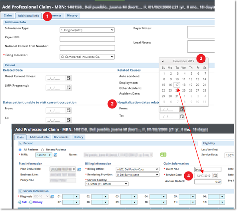 - Las fechas de hospitalización relacionadas con la fecha de servicios actual se abren de acuerdo con la fecha de servicio de la reclamación.