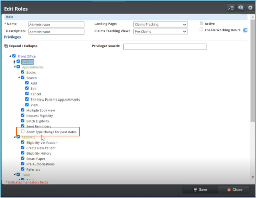 • ¿Necesita que el personal de la oficina pueda editar el Appointment Type de las Citas después de que hayan ocurrido? Ahora puede cambiar el Appointment Type para citas pasadas. Un nuevo permiso en la pantalla Roles Management le permite activar o desactivar la edición de Appointment Type en Citas pasadas.