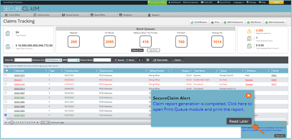 • Una vez que este informe esté listo, haga clic en el texto de la notificación o navegue hasta Front Office > Tools > Print Queue. El trabajo de impresión se llamará Multiple Claims [número de facturas impresas] [número de pieza]. Si ha impreso más de cincuenta (50) reclamaciones, el trabajo de impresión se dividirá en dos partes para ayudar a evitar errores de impresión. Por ejemplo, si imprime 75 facturas, verá el trabajo de impresión listado como Multiple Claims 50 (Part 1) and Multiple Claims 25 (Part 2)