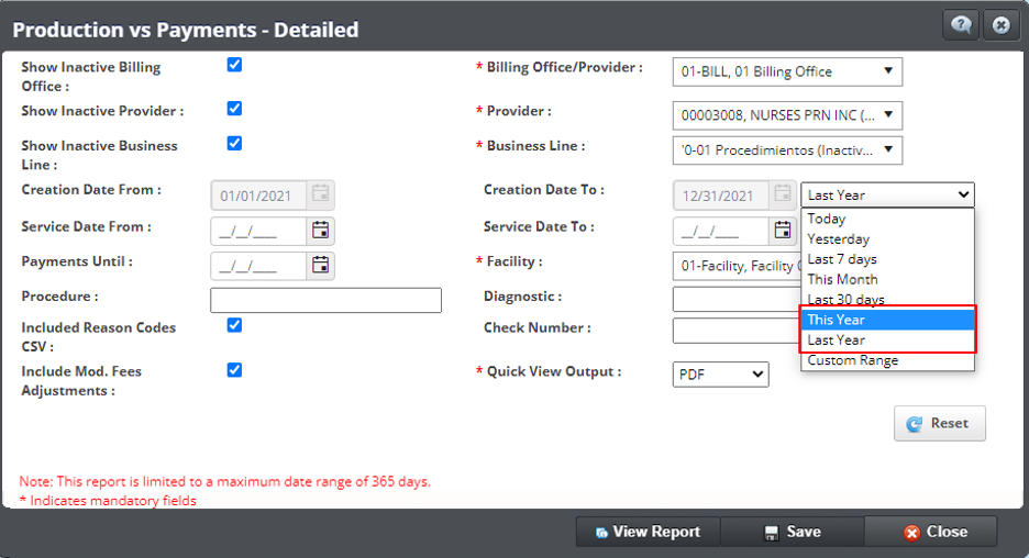 - Se añaden 2 opciones adicionales en el campo de Date Range en todos los reportes. Las opciones de This Year y Last Year le permiten configurar los reportes para que muestren resultados durante el año en curso y el pasado año sucesivamente. Al escoger estas opciones le ayudará a imprimir reportes anuales más rápido sin proceso largo de carga del reporte evitando errores.