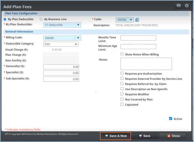 - Añada tarifas más fácilmente con la nueva funcionalidad de Save & New. Ahora podrá añadir tarifas sin necesidad de cerrar y reabrir la pantalla de Add Plan Fees y escoger de nuevo el Plan Deductible / Business Line.