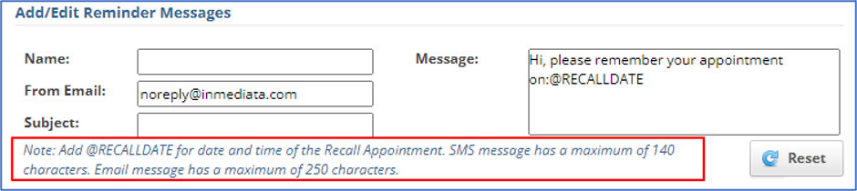 - La sección Recall Reminders de la página de Application Settings también se ha actualizado con un texto similar al que aparece en la página de Appointment Book. El nuevo texto incluye límites de caracteres para mensajes de correo electrónico y SMS (texto), así como el comando disponible para incluir información como @RECALLDATE (fecha y hora de la cita).