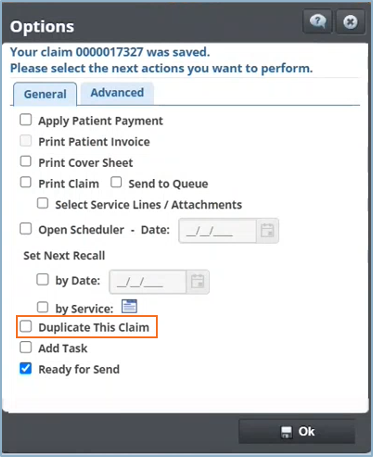 - La nueva opción de Duplicate this Claim le permitirá duplicar la última factura de un paciente. Esto le permite crear rápidamente una factura cuando un paciente acude regularmente para el mismo tipo de visita/tratamiento.