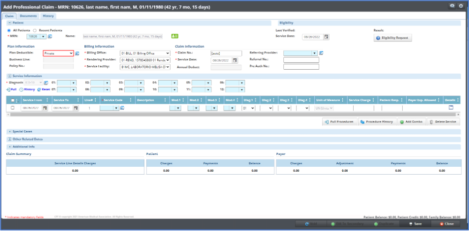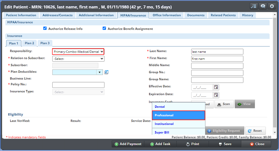 - Hemos agregado la capacidad de crear facturas sin plan de seguro médico en la pestaña de HIPAA/Insurance. Esto permite la creación de facturas para pacientes con pago privado.