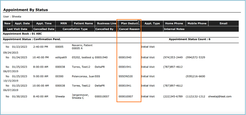 - El reporte de Appointment By Status se ha actualizado para agregar una columna de deducible del plan después del Business Line. Esto permitirá ver los códigos de deducibles junto con otra información del reporte. Se mostrará en informes imprimibles/PDF y al exportar a Excel.