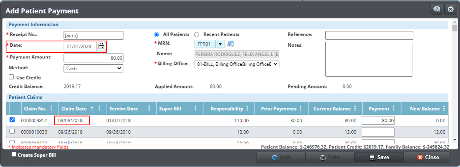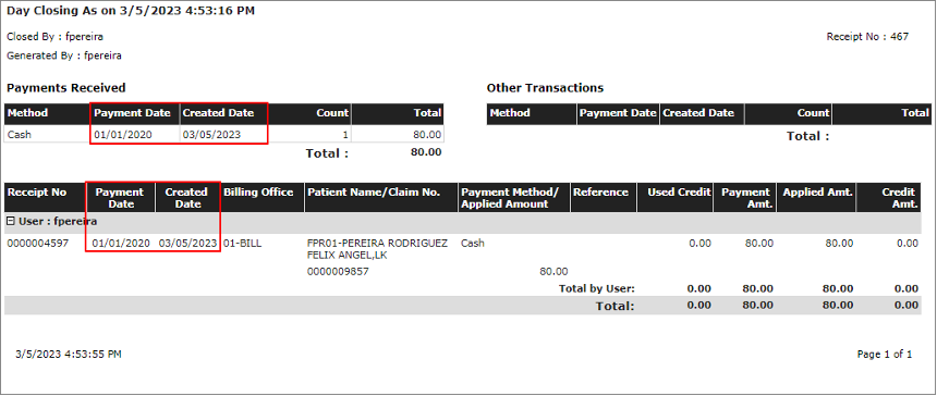 - El campo Payment Date se ha actualizado para permitir fechas más antiguas. Anteriormente, la fecha no podía tener más de un año en el pasado. Los informes Daily Closing y Daily Closing History se han actualizado para agregar la información de la fecha de creación y la fecha de pago de los pagos del paciente para un mejor seguimiento de los eventos.