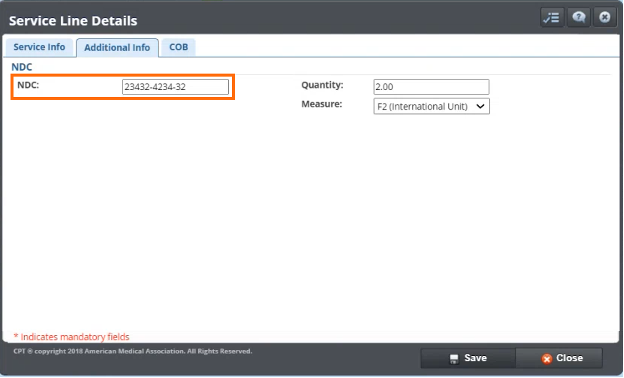 - Se agregaron campos para códigos NDC para facturas Institucionales en la pestaña Additional Info de la ventana de Service Line Details. Algunos pagadores han requerido los códigos NDC para ciertos tipos de procedimientos, por lo que agregar estos campos ayuda a mantener el cumplimiento de los requisitos del pagador.