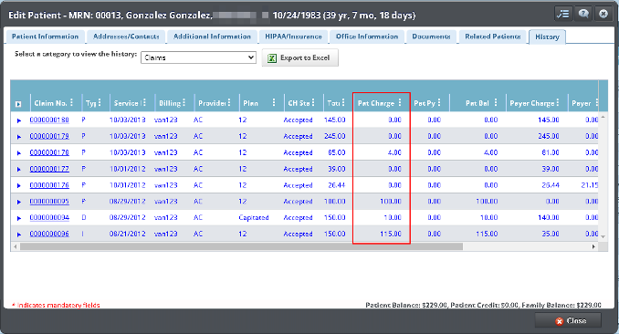 - Se agregó una columna de Patient Charge en la pestaña de History en la opción de facturas (Claims) del récord del paciente. Esto le permite realizar un seguimiento de los deducibles de los pacientes más fácilmente sin abrir cada factura desde el récord del paciente.