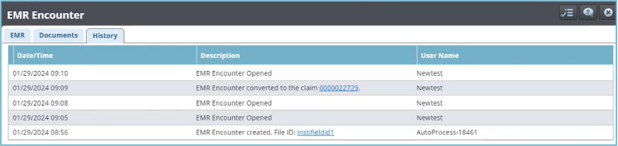 EMR Encounters En la pestaña EMR Encounter History, hemos agregado la posibilidad de que se muestre un hipervínculo de archivo para el HL7. Esto le permite ver los datos HL7 sin procesar para el encuentro, que se pueden descargar como un archivo XML.