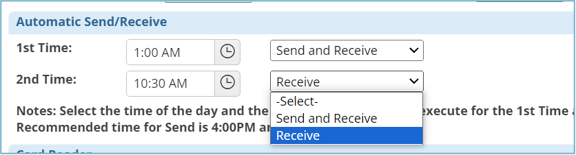 - In Application Settings (General tab) the Automatic Send/Receive section has been updated to allow scheduling for auto-submission to and from the clearinghouse. Select the times and actions (choose from Send, Receive, or Send and Receive) to complete this section. Once completed, the selected transmission will complete automatically. This allows you to auto-submit claims that are ready to send, and to automatically receive responses from the clearinghouse.