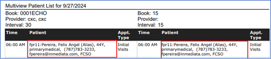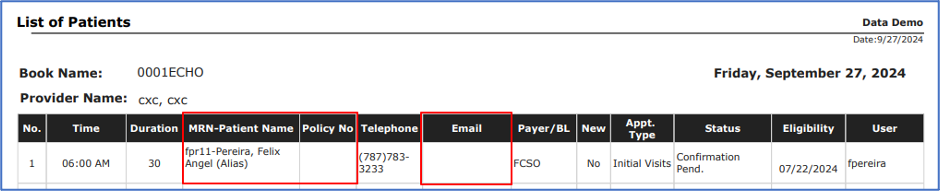 - The printed reports have been updated to include additional patient information, improving visibility in the appointment reports. The Regular and List reports have changed the Patient Name column to MRN-Patient Name and added both Policy Number and Email columns to the report. In the Multiple report, the Patient Name has been renamed to Patient, and now includes multiple patient details, such as name, MRN, policy number, contact information, and eligibility status.