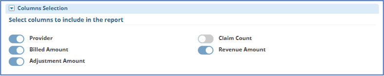 - Report configuration has been updated with a Columns Selection segment which has been added to the report parameters. This includes toggles for optional data columns to include in the report. These are on by default but can be toggled off to remove that data from the report. This allows you to streamline reports by excluding columns you don’t need.