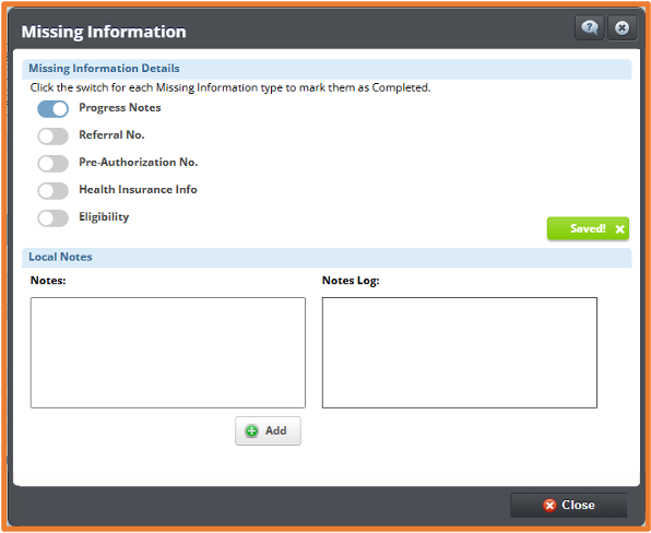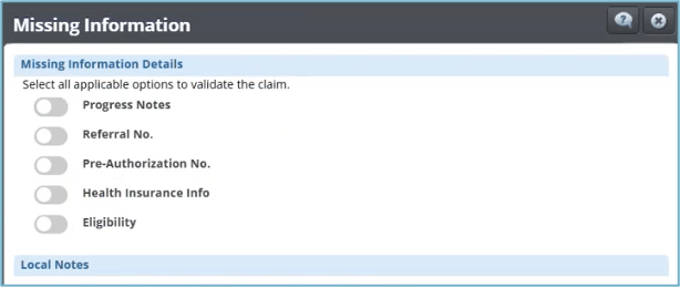 - The Missing Info popup has been updated with Missing/Completed toggles instead of the C-complete and M-missing icons. Moving the toggle from missing to complete will cause the system to run a validation on the items marked complete when you leave the Missing Information window.