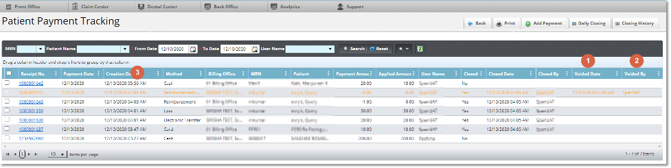 - Now you will see in the Patient Payment Tracking view the user, voided date and creation date of payments that are Voided.