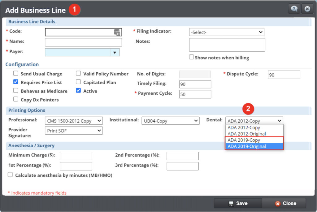 - In the Business Lines configuration, the new dental billing form ADA 2019 original/copy is included, and the ADA 2016 form original/copy has been removed.