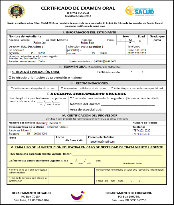 - The impression of The Oral Exam Certificate of Puerto Rico Health Department was implemented in the Patient Record.