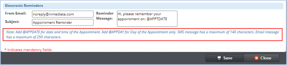 - The Edit Appointment Book page has been updated with a reminder on how to format Electronic Reminders. The reminder includes character limits for email and SMS messages, as well as the available commands to include information like @APPDATE (date and time of the appointment) and @APPDAY (day of the appointment) shortcuts.