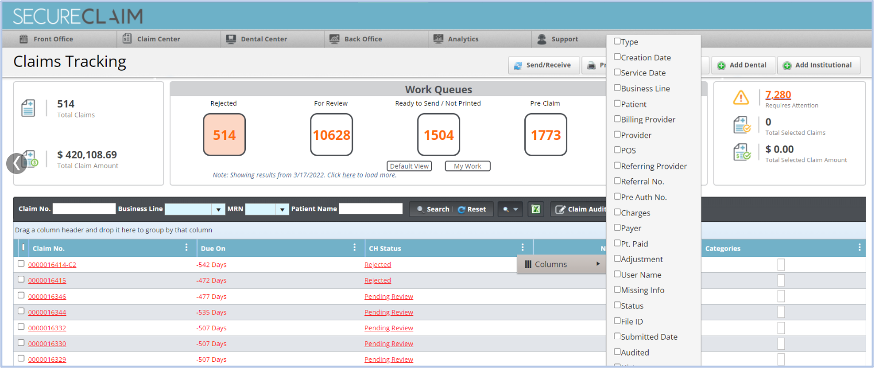 - Column configurations can now be saved while using the Claims Tracking Work Queues. The system will remember the columns configurations when you navigate out and return to a Work Queue.