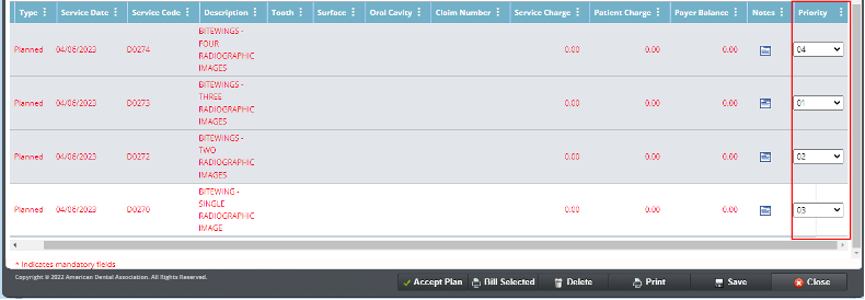 - Dental Chart has been improved to add more functionality. Now you can sort the order of the Planned Service lines for Treatment plans by priority.