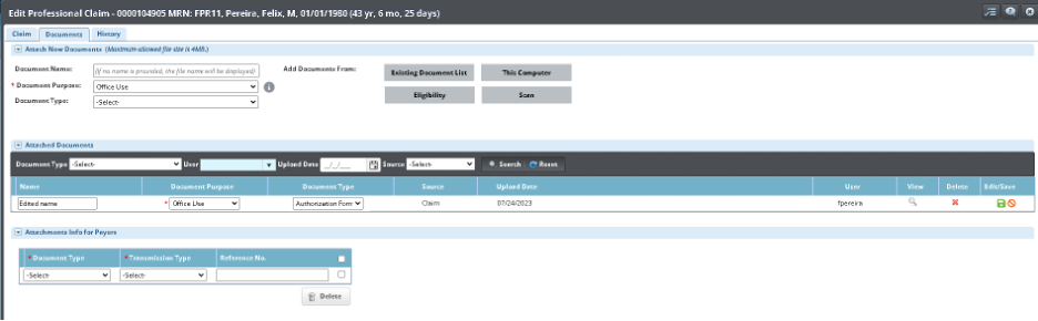 - Updates have been made to the Documents tab in Professional, Dental, and Institutional claims. Users now can edit the Name, and Type of files they have added to the Documents tab. Click the Edit button and Save button to edit and save changes.