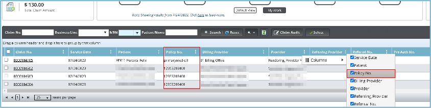 - A Policy column has been added to the claims tracking area so that the policy number on a claim is visible from the list without opening the claim, and the list of claims can be organized by the associated policy number.