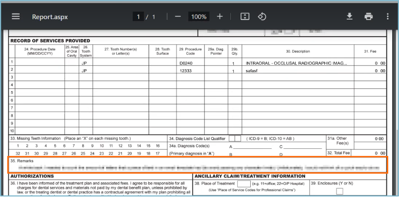 - Dental Chart has been improved to allow you to add Payer Remarks to Predetermination ADA forms. A Payer Note field has been added to the Predetermination for Payer on the Print Options screen.