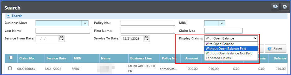 Payer Payments We have made improvements to the process of adding claims to payer payments that do not have an open balance, such as Capitated Claims. We have changed the options available in the “Add Claims > Display Claims” dropdown field. Now, users can select between the options “Without Open Balance Paid“, for claims that have a payment, and “Without Open Balance Not Paid“, for claims that do not have a payment.